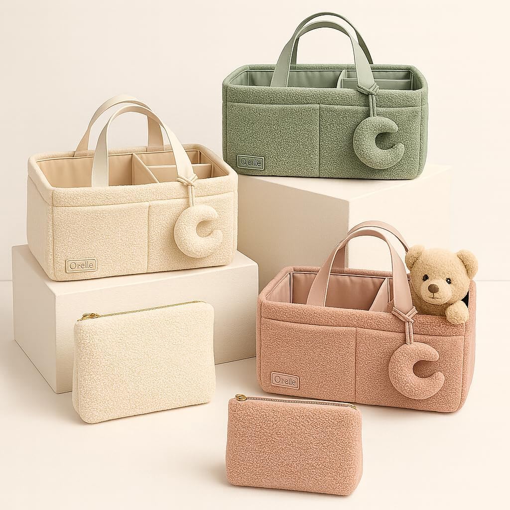 Meet the Orelle Teddy Boucle Diaper Caddy — where cozy meets chic. Plush boucle, vegan-leather accents, and a soft moon charm turn everyday organization into something beautiful.